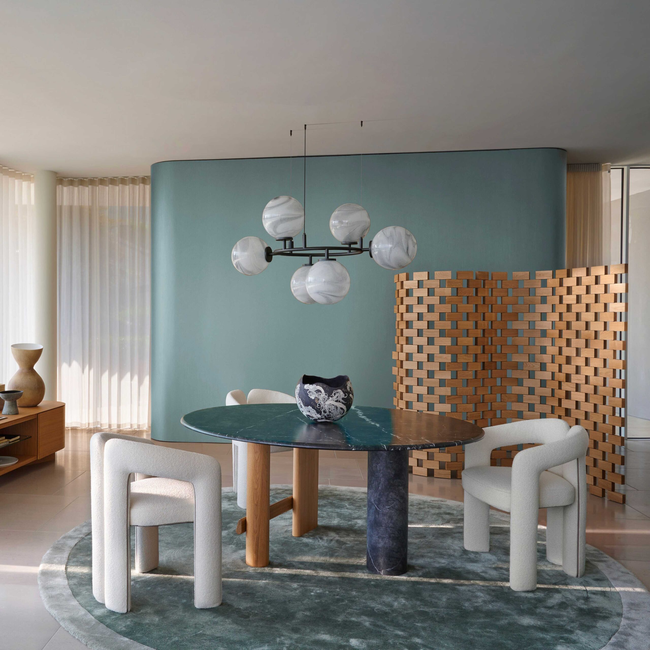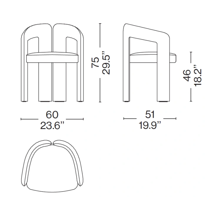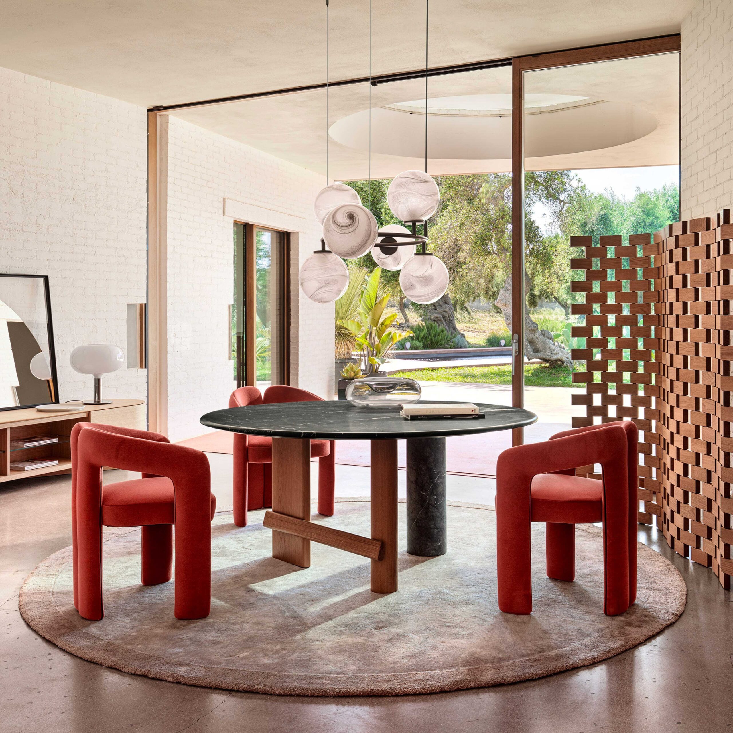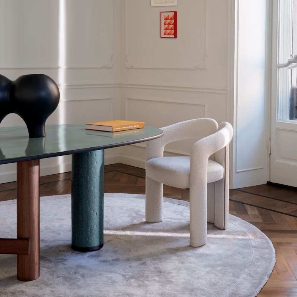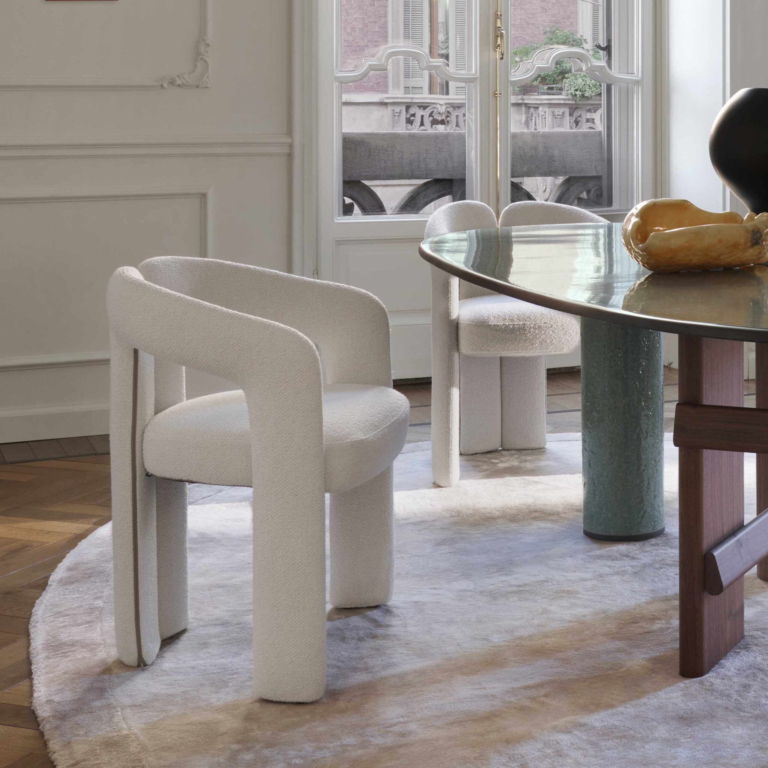 The small armchair is very evocative and strongly references 1970s design. Dudet is a small architecture defined by three individual padded elements: a seat cushion and two tubes that fluidly design its legs, armrests and backrest in a continuous line. The soft and comfortable appearance of the Dudet armchair strikes immediately and, under its welcoming curves, it has a conscious soul thanks to the fact that its elements can be easily disassembled. An innovative system that, with a view to circularity, allows its metal core to be separated from the polyurethane foam padding made with a percentage of polyols deriving from biological sources. This facilitates both the disposal of the separate pieces and the recycling of its noble materials like its steel core.