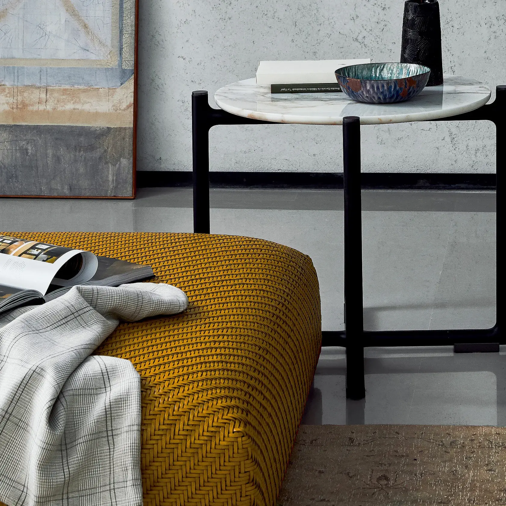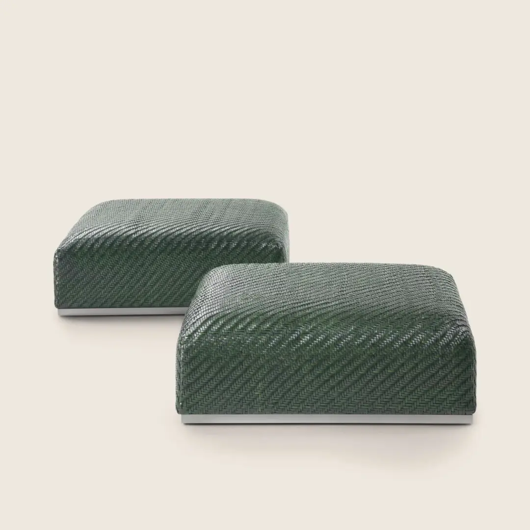 Cowhide, woven in an exquisite herringbone pattern, lends palpable appeal to the Carmen ottoman. Square-shaped and available in two sizes, the Carmen ottoman is a sophisticated accessory that lends a touch of enchantment to the decor of residential as well as hospitality spaces, like lobbies, lounges and suites.