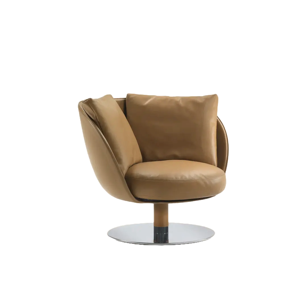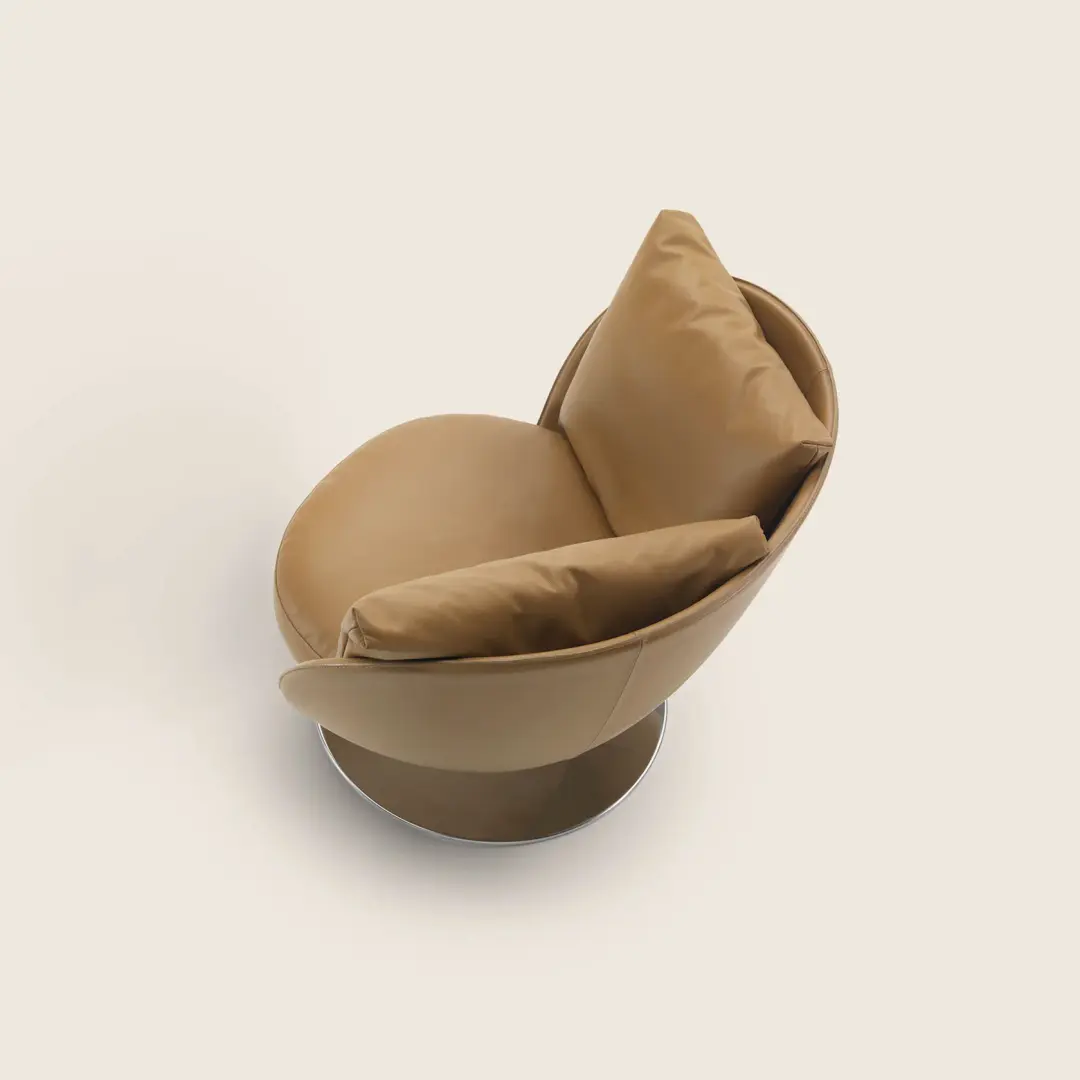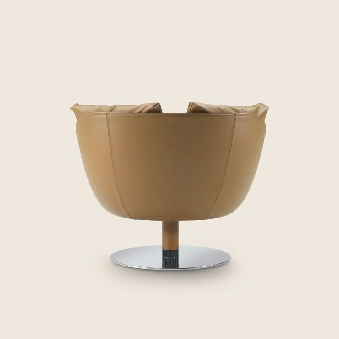 Armchair shell / swivel armchair in rigid polyurethane laminated to polyurethane foam upholstered in leather or fabric in the following combinations for the inside and outside: entirely in leather (all the leathers in the collection); entirely in fabric; fabric inside and leather outside (all the leathers in the collection)