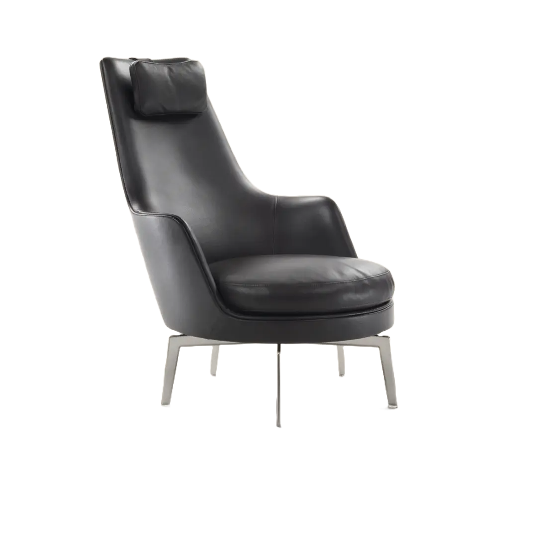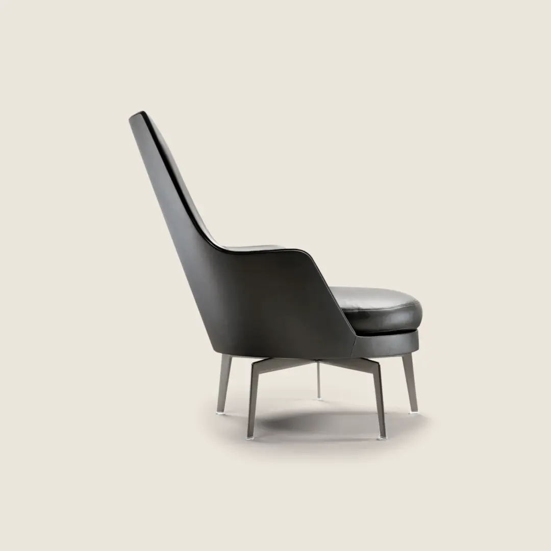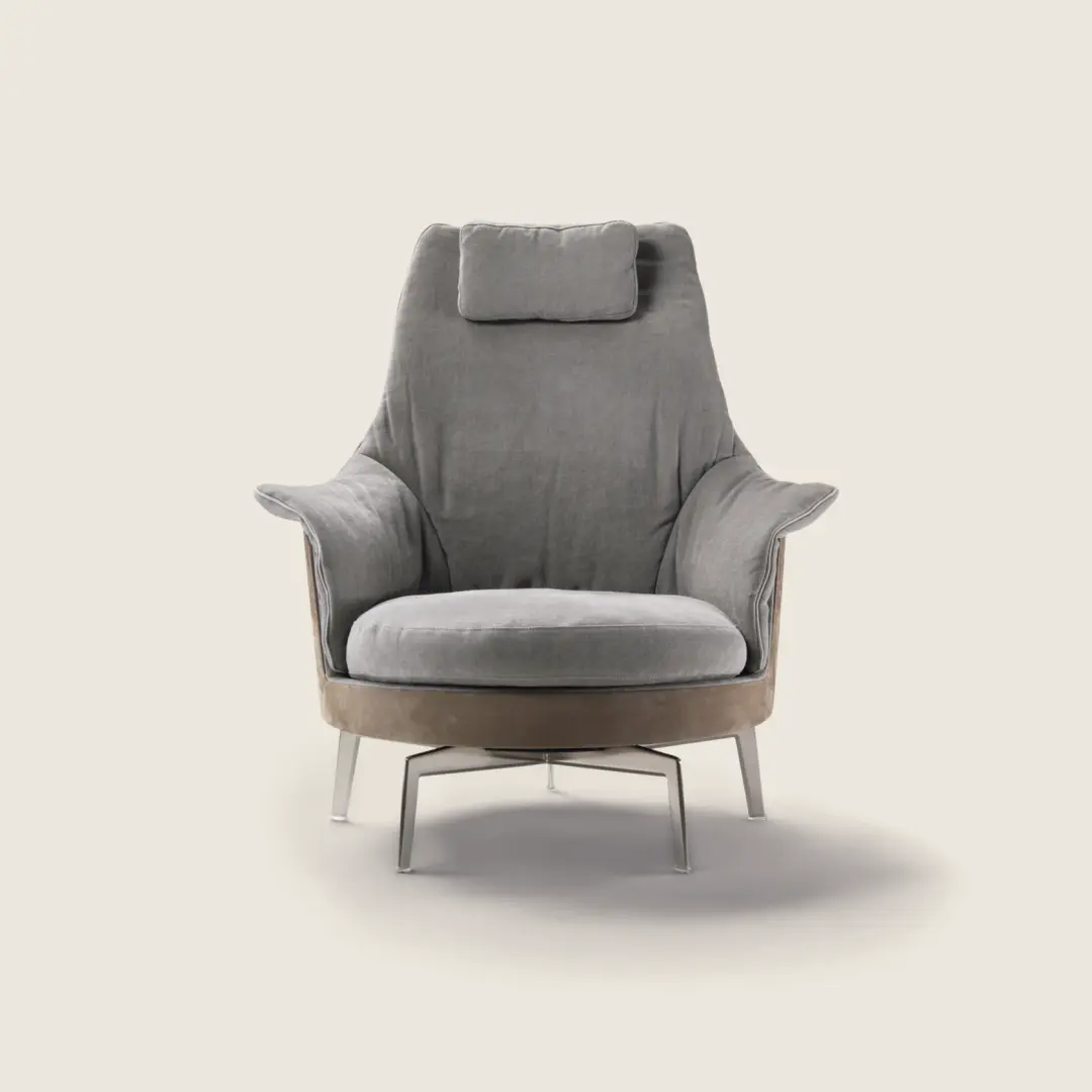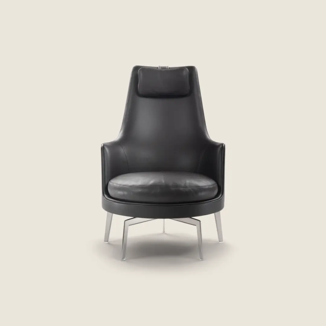 Guscioalto is an especially comfortable, high-backed wing chair (bergère) known for its couture tailoring. The structure is an enveloping shell made of structural polyurethane foam, while the seat cushion is in goose down with a core insert in crushproof material. To ensure the utmost in comfort, the Guscioalto Soft version comes with additional padding in the seat back and an extra layer of Dacron and memory foam. For an extraordinarily comfortable seating experience, Guscioalto Light features a unique contoured upholstered element – with easily removable and washable upholstery – that attaches to the seatback with velcro. The Guscioalto armchairs come with a lightweight, uncluttered – swivel or non-swivel – base with metal legs, based on an exclusive Flexform design, and available in different finishes. They also come in a version with wood base and legs in solid wood, available in a number of shades.