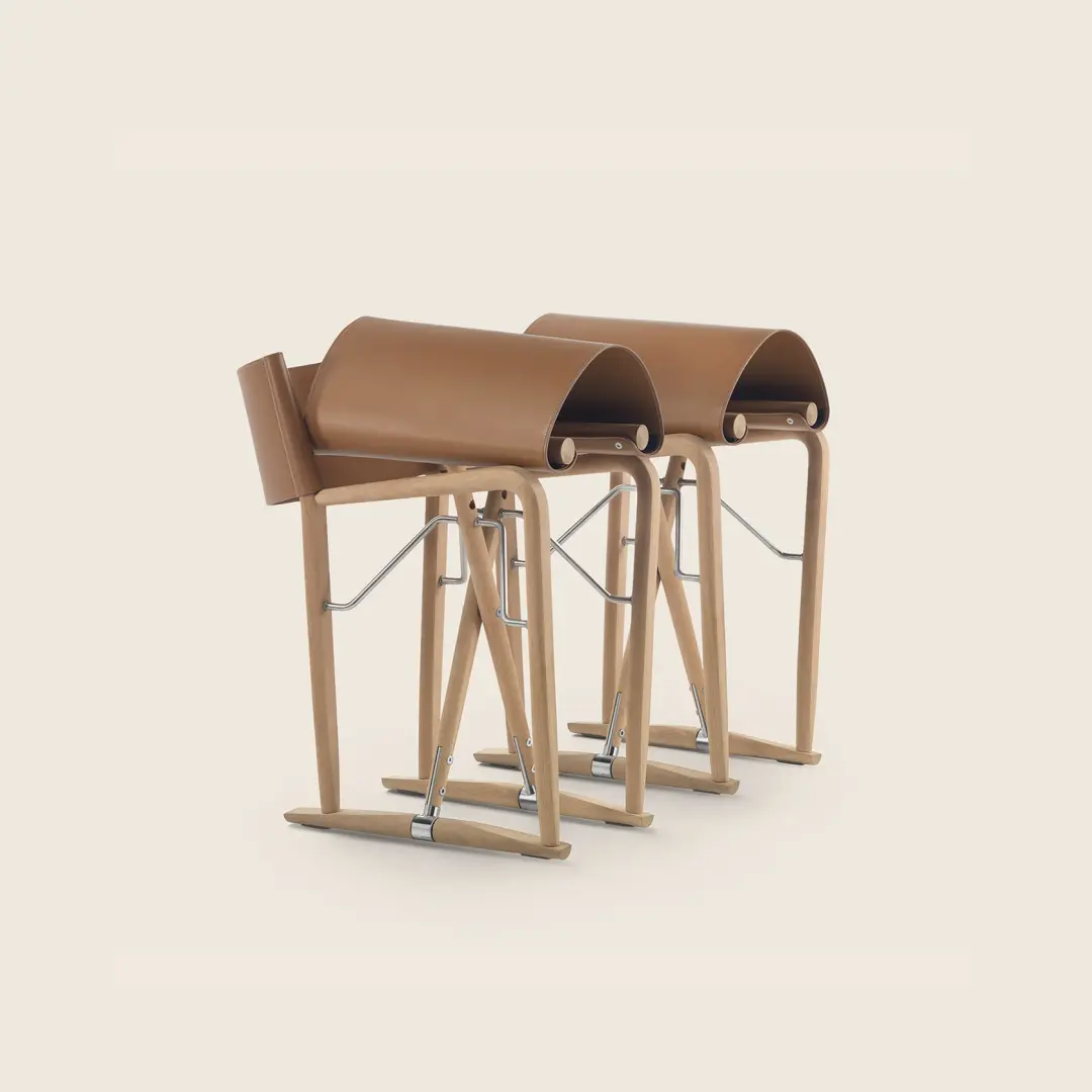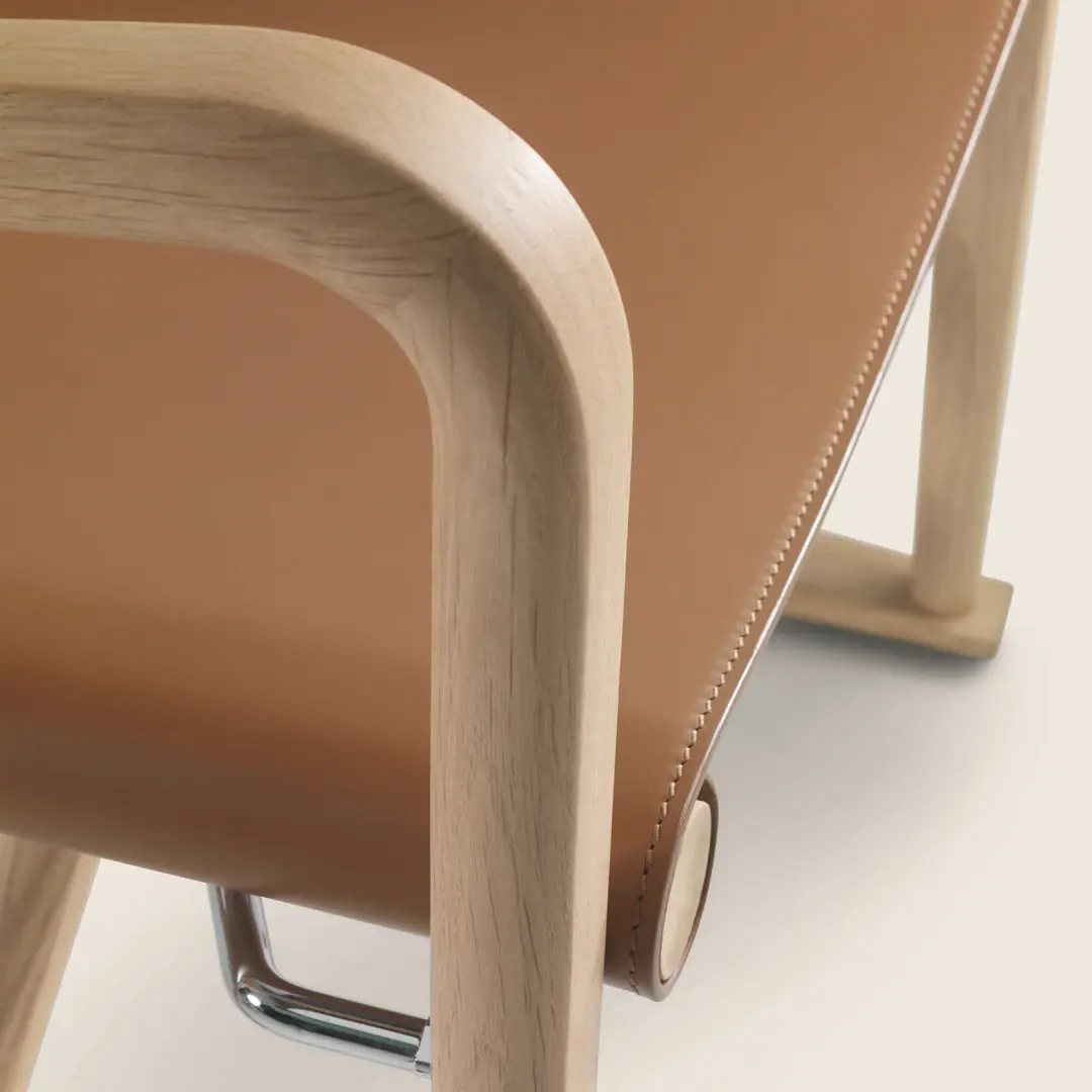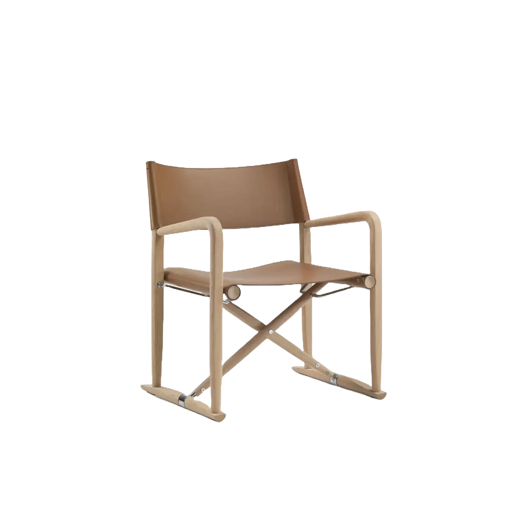 Made of solid hand-turned and finished wood, with the seat and backrest in cowhide, the Luchino armchair – available in both dining and lounge versions – features refined joints that enable easy folding and transport.