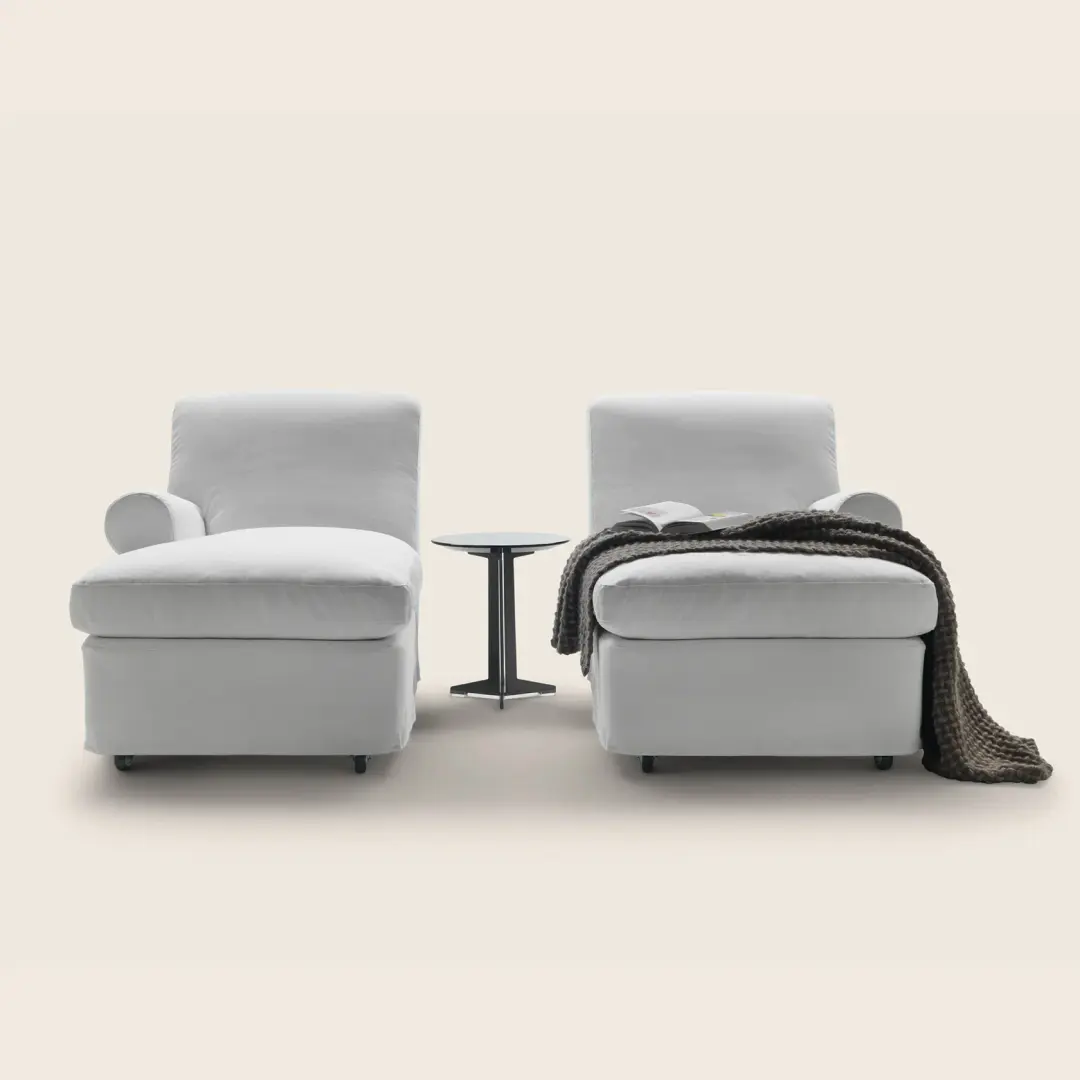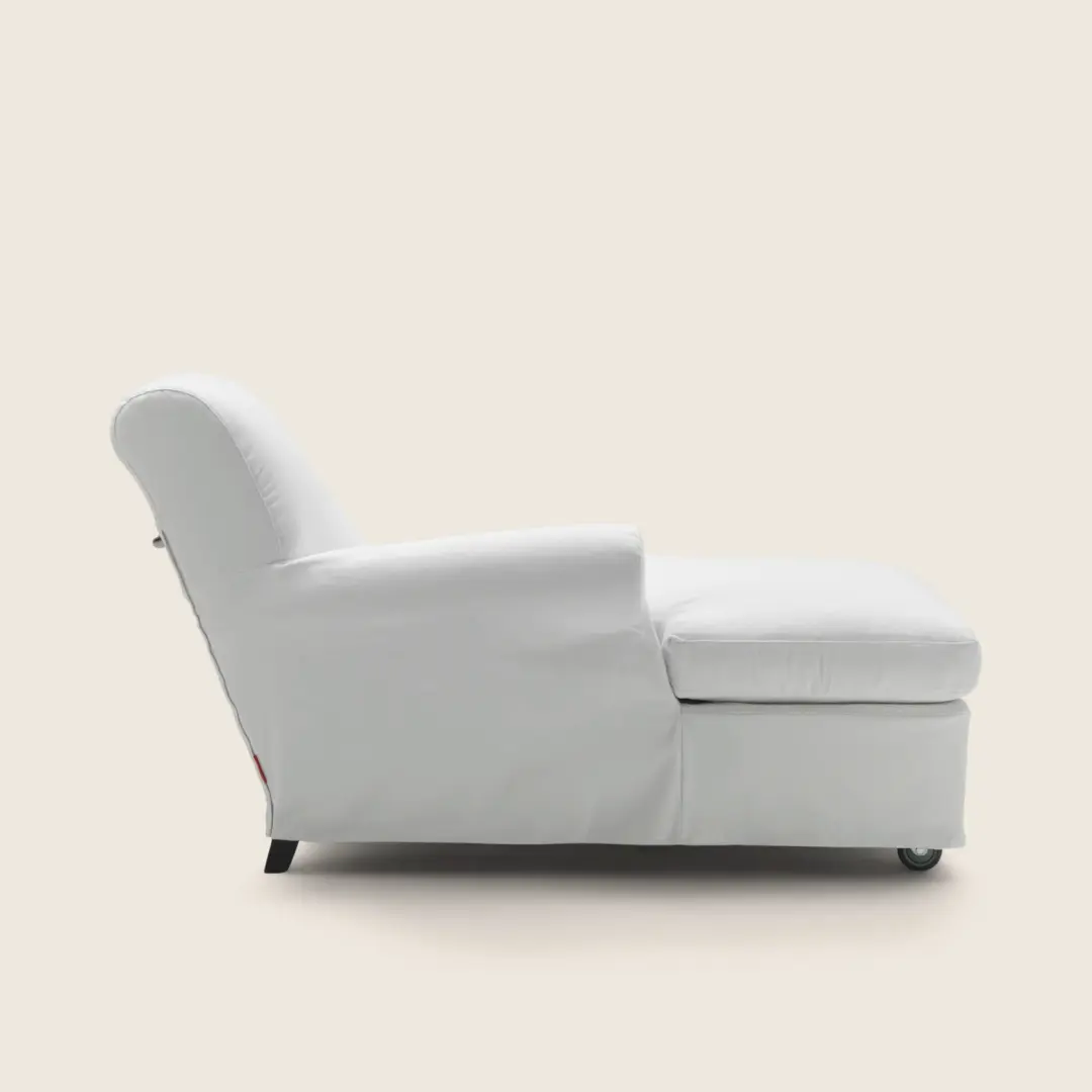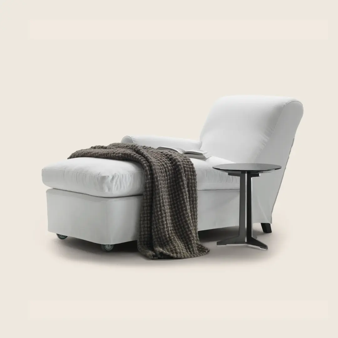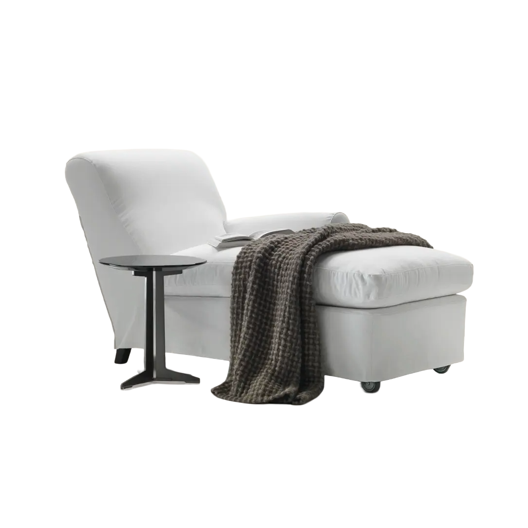The Nonnamaria daybed, like the entire “family sofas” collection, revisits the style of the 1980s, investing it with a more contemporary spirit. The daybed’s clearly-reassuring and homey appearance is influenced by the collective memory but is finally freed of the superfluous frills and decorative details that weighed down the line. Upholstered in a no-nonsense soft, lightweight slipcover that can be easily removed, the Nonnamaria daybed gains a light, fresh appeal. A handle on the seat back and practical front self-locking casters make the Nonnamaria daybed easy to move.