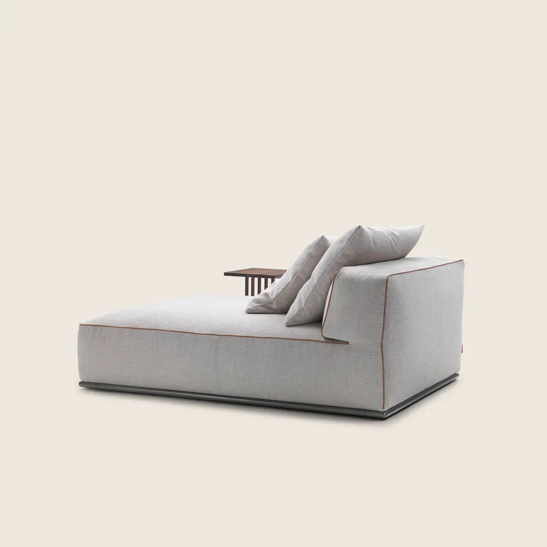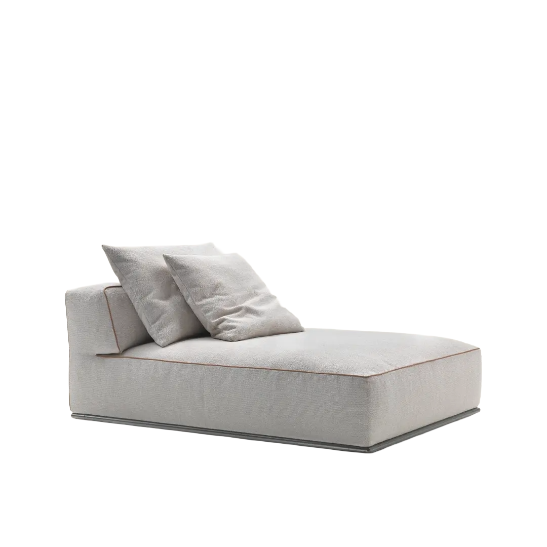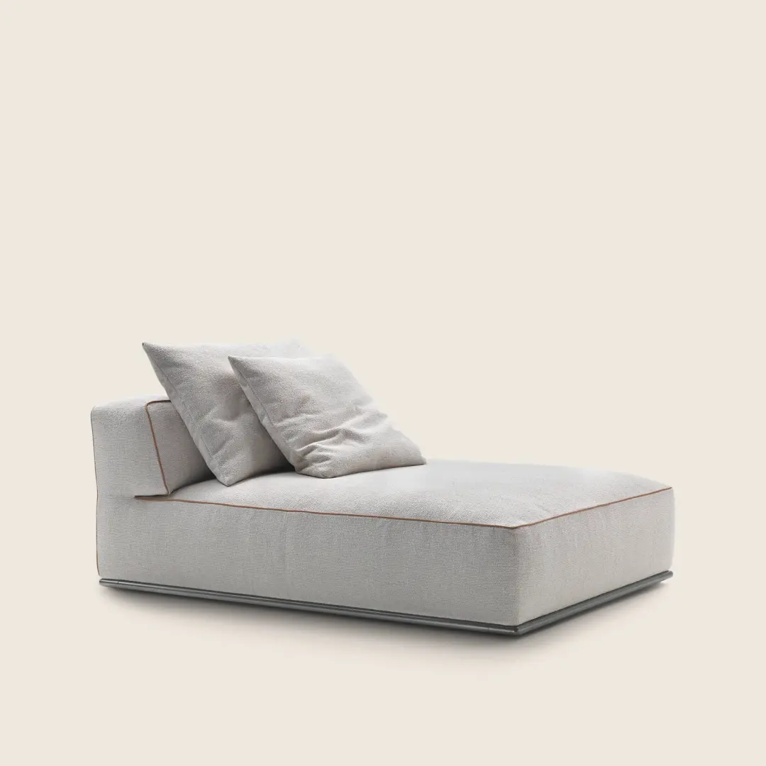 Volumes generously padded with goose down, calibrated proportions, refined manufacturing details such as the profile that outlines the silhouette of the Perry chaise longue constitute the distinctive features of a project with an unconventional character.