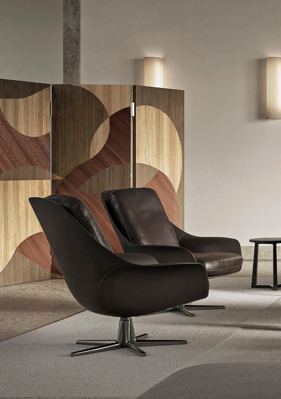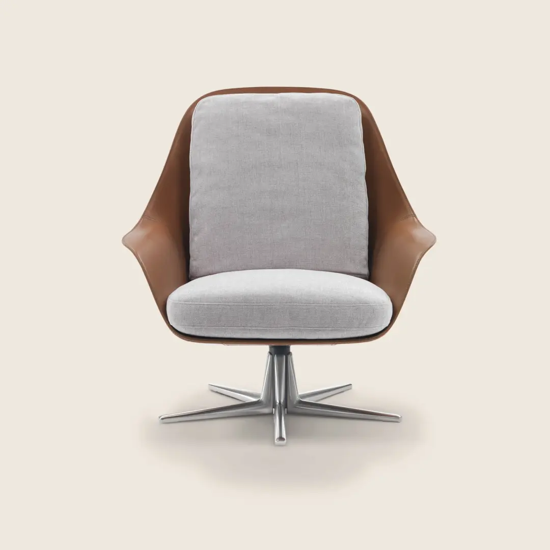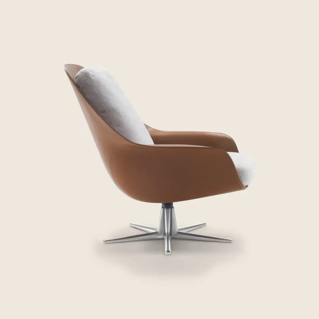 The sophisticated silhouette of the Sveva armchair reveals its unmistakable personality while silently telegraphing its generously welcoming appeal. A shapely shell made of rigid structural polyurethane and then upholstered in saddle hide accommodates the soft, goose down filled seat and seat back cushions. The cast aluminium swivel base comes in versions with four or five spokes, the latter specifically designed to meet the needs of the contract market. The metal base is available in different types of finishes. Between the saddle hide shell – available in an array of colours – and the cushion upholstery options, that can be created in all the exclusive Flexform collection of fabrics and leathers, countless combinations are possible. The Sveva armchair can be paired with its own namesake ottoman. With its sophisticated yet uncomplicated lines, the Sveva armchair is a perfect match with all the sofas in the collection and is confidently at home in both residential and hospitality interiors.