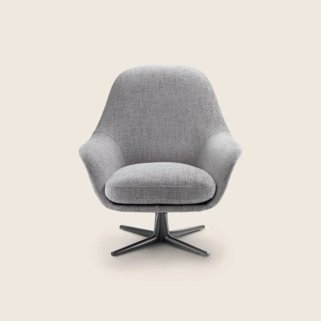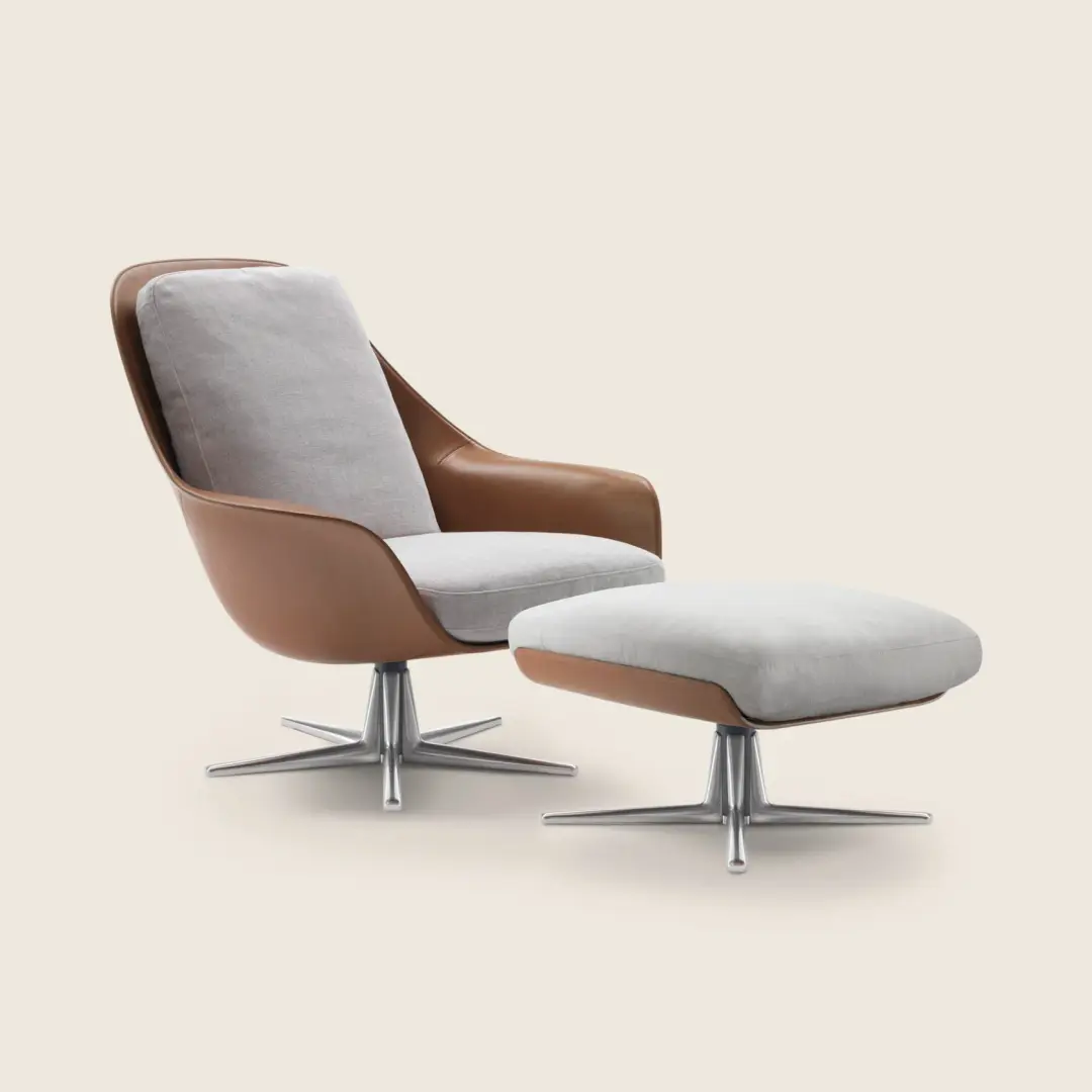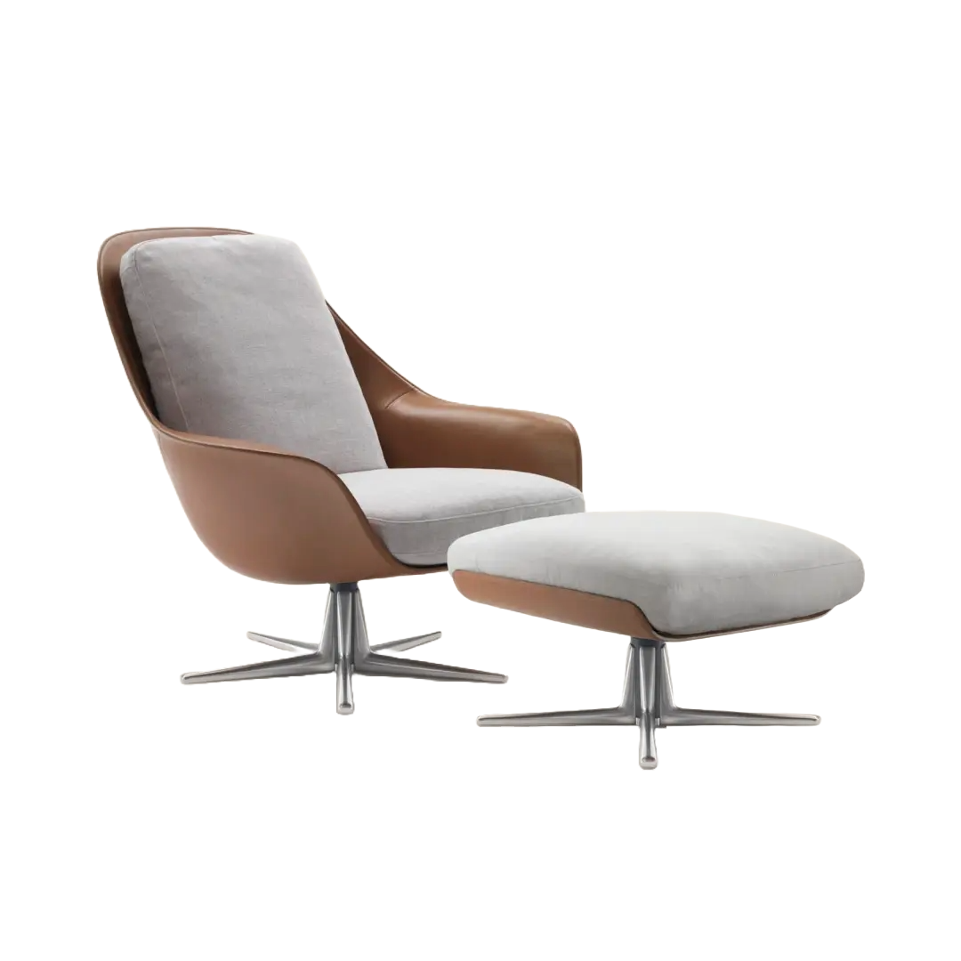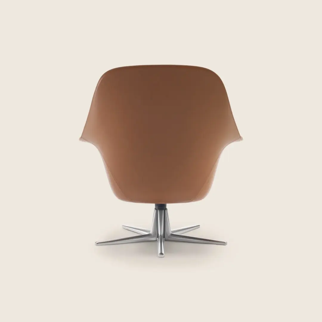 The sophisticated silhouette of the Sveva armchair reveals its unmistakable personality while silently telegraphing its generously welcoming appeal. A shapely shell made of rigid structural polyurethane and then upholstered in saddle hide accommodates the soft, goose down filled seat and seat back cushions. The cast aluminium swivel base comes in versions with four or five spokes, the latter specifically designed to meet the needs of the contract market. The metal base is available in different types of finishes. Between the saddle hide shell – available in an array of colours – and the cushion upholstery options, that can be created in all the exclusive Flexform collection of fabrics and leathers, countless combinations are possible. The Sveva armchair can be paired with its own namesake ottoman. With its sophisticated yet uncomplicated lines, the Sveva armchair is a perfect match with all the sofas in the collection and is confidently at home in both residential and hospitality interiors.