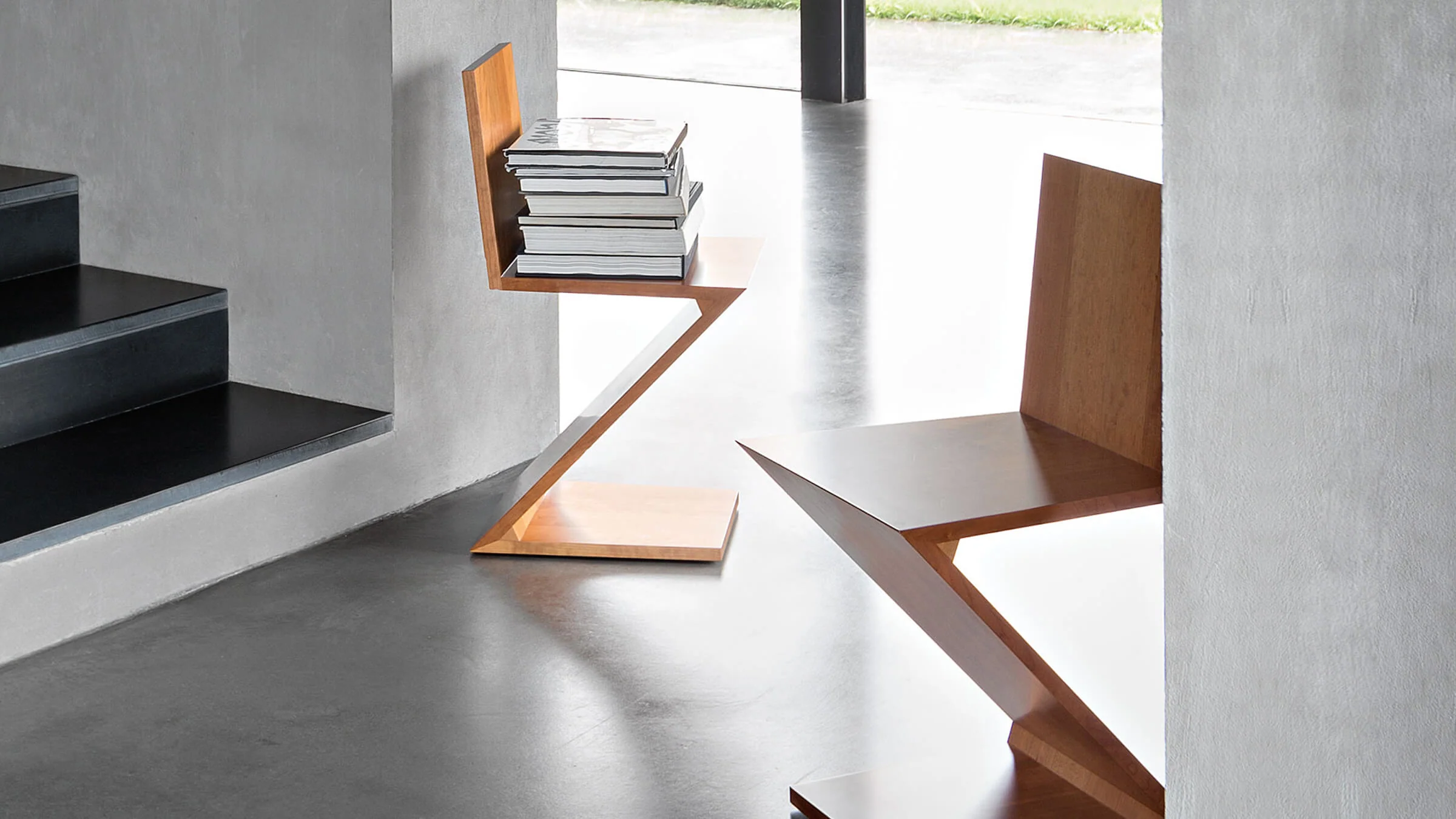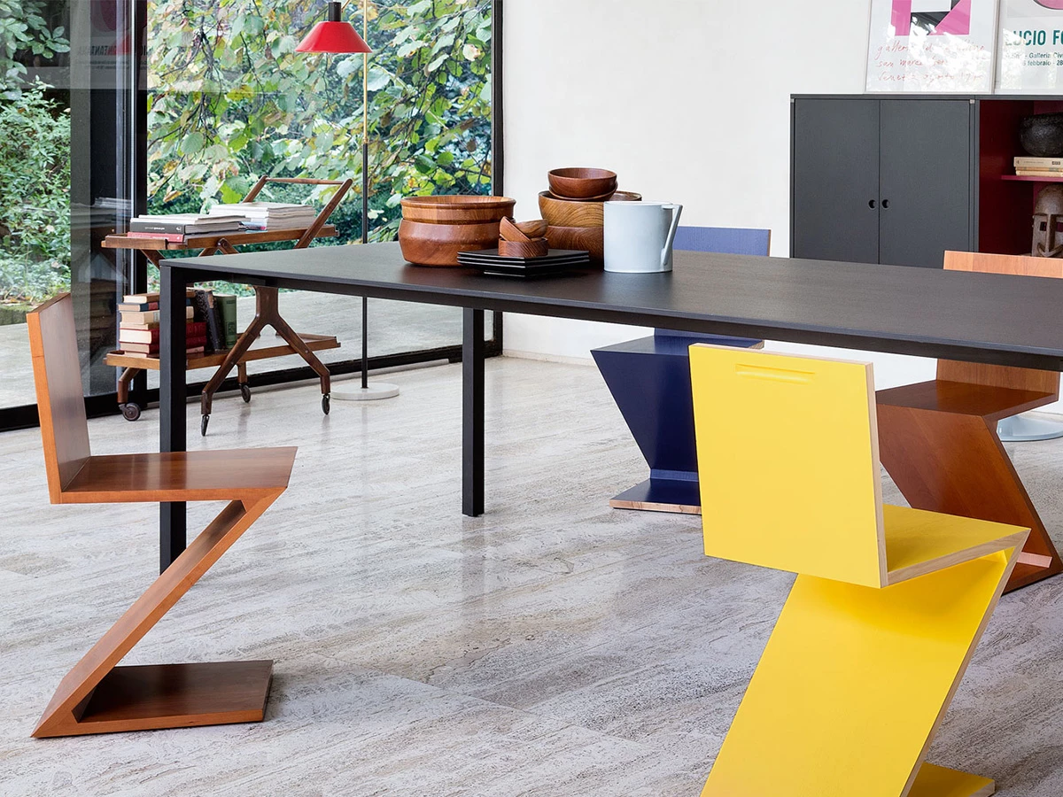 Designed by Gerrit Rietveld, this chair provided an early example of a cantilevered seat, and is composed of four wood boards articulated end-to-end to form an extremely eye-catching example of an unstable structure. Eschewing the traditional legs-seat-back sequence, Rietveld created a ribbon of wood forming a Z-shape. The crafts mastery of Cassina’s carpenters is seen in the execution of the dove-tail joints, which add to the beauty of the piece. The aesthetic uniqueness of this piece can be seen particularly well in the coloured version, its open-pore finish highlighting the veins of the wood on the front and sides. This finish reflects a number of variations on the theme made by Rietveld, designed to highlight the relationship between the vertical, oblique and horizontal lines.